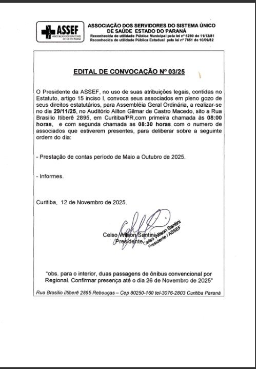 O Presidente da ASSEF, no uso das suas atribuições legais, contidas no Estatuto, artigo 15 inciso l, convoca seus associados em pleno gozo de seus direitos estatuários, para Assembleia Geral Ordinária, a realizar-se no dia 29/11/25 , no Auditório Ailton Gilmar de Castro Macedo, sitio a rua Brasilio Itiberê 2895, em Curitiba/PR , com primeira chamada as 08:00 horas, e com segunda chamada as 08:30 horas com o número de associados que estiveram presentes, para deliberar sobre a seguinte ordem do dia: